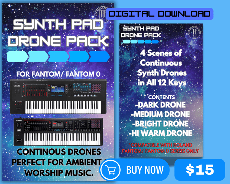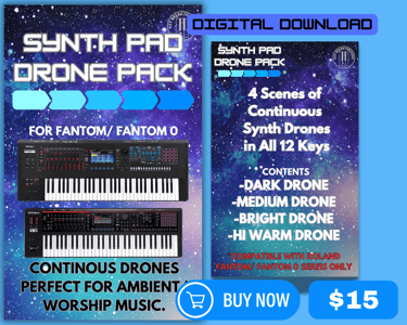 4 Scenes of Continuous Synth Pad Drones, in All 12 Keys. Perfect for ambient/ worship music. Drones are accessible on performance pads.